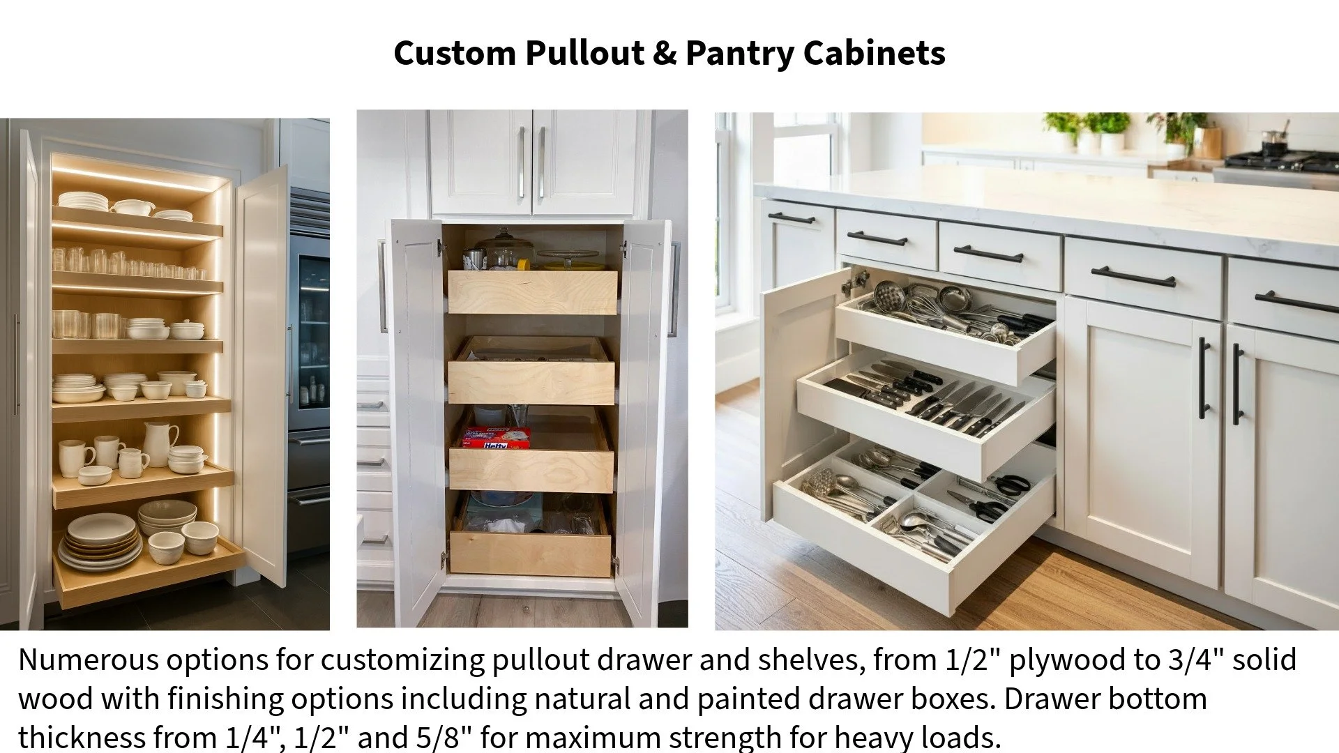 Enhance functionality and organization: Go beyond basic storage with custom solutions like pull-out pantries, spice racks, and specialized drawer dividers, all designed to make your cooking and cleaning more efficient and organized.