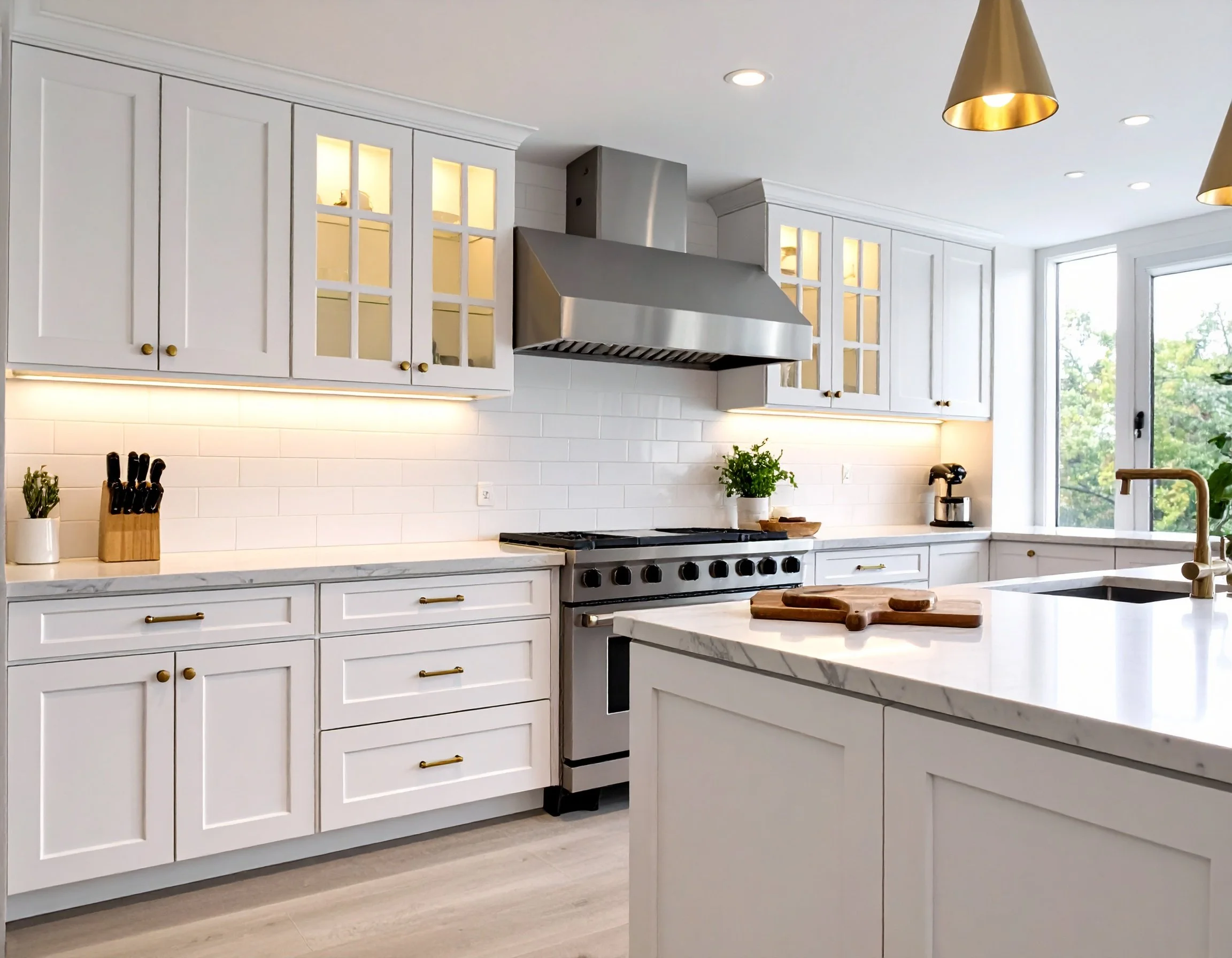 Combination Factory and Custom Cabinets. Upgraded Factory White Wall Cabinets, Custom Exhaust Hood Cabinet and Custom Island