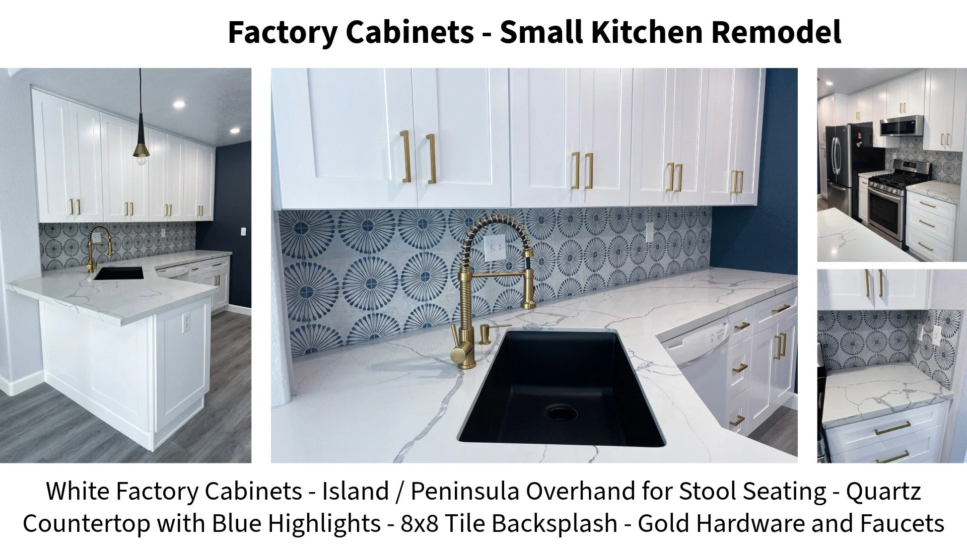 White Factory Cabinets for Wall & Base Cabinets. Island Modifications Include Custom Frame for Factory Black Doors Panels. Custom Hood Cabinet.