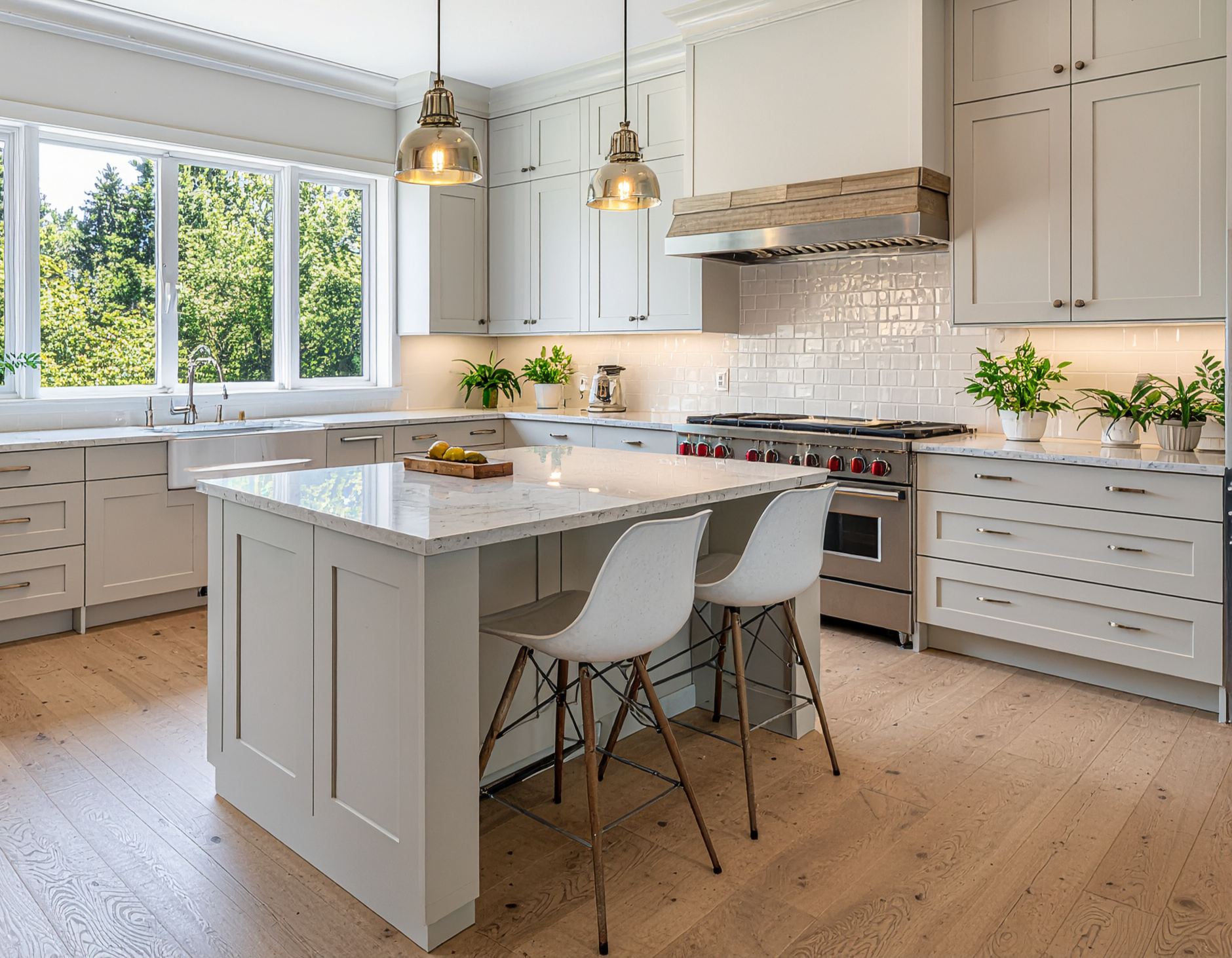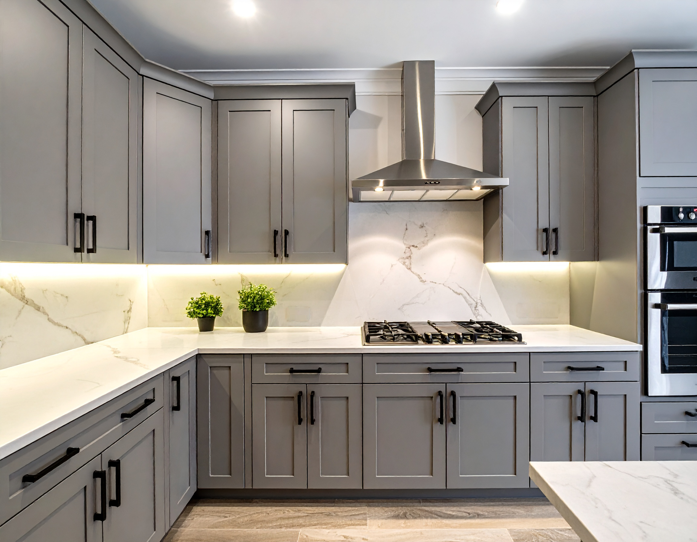 Combination Factory and Custom Cabinets. Upgraded Factory White Wall & Base Cabinets, Custom Exhaust Hood Cabinet and Custom Island with Inset Dark Grey Factory Cabinets for Storage