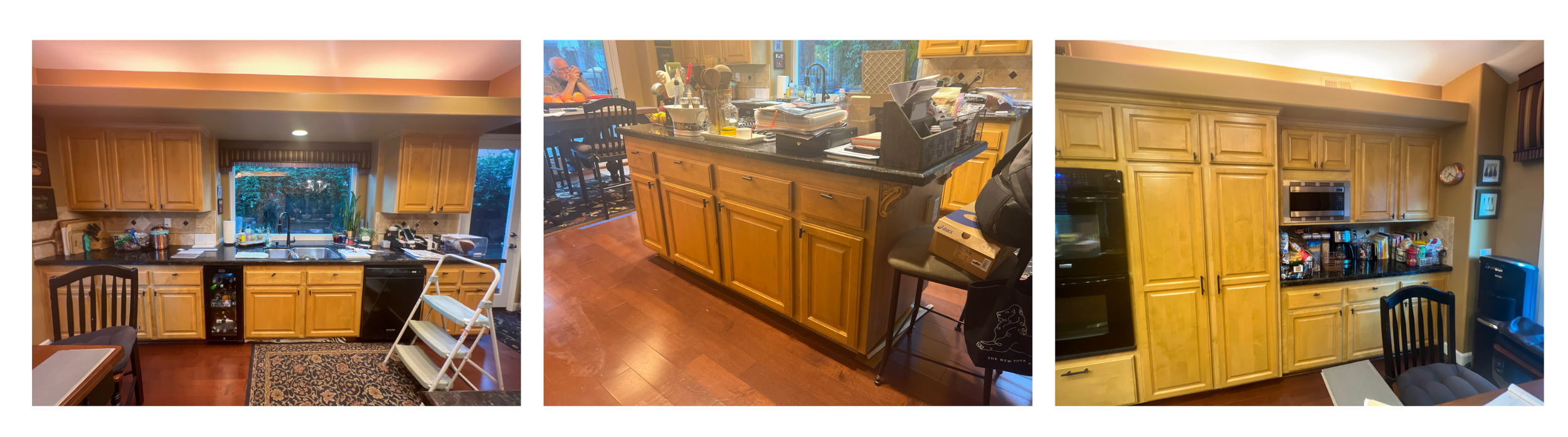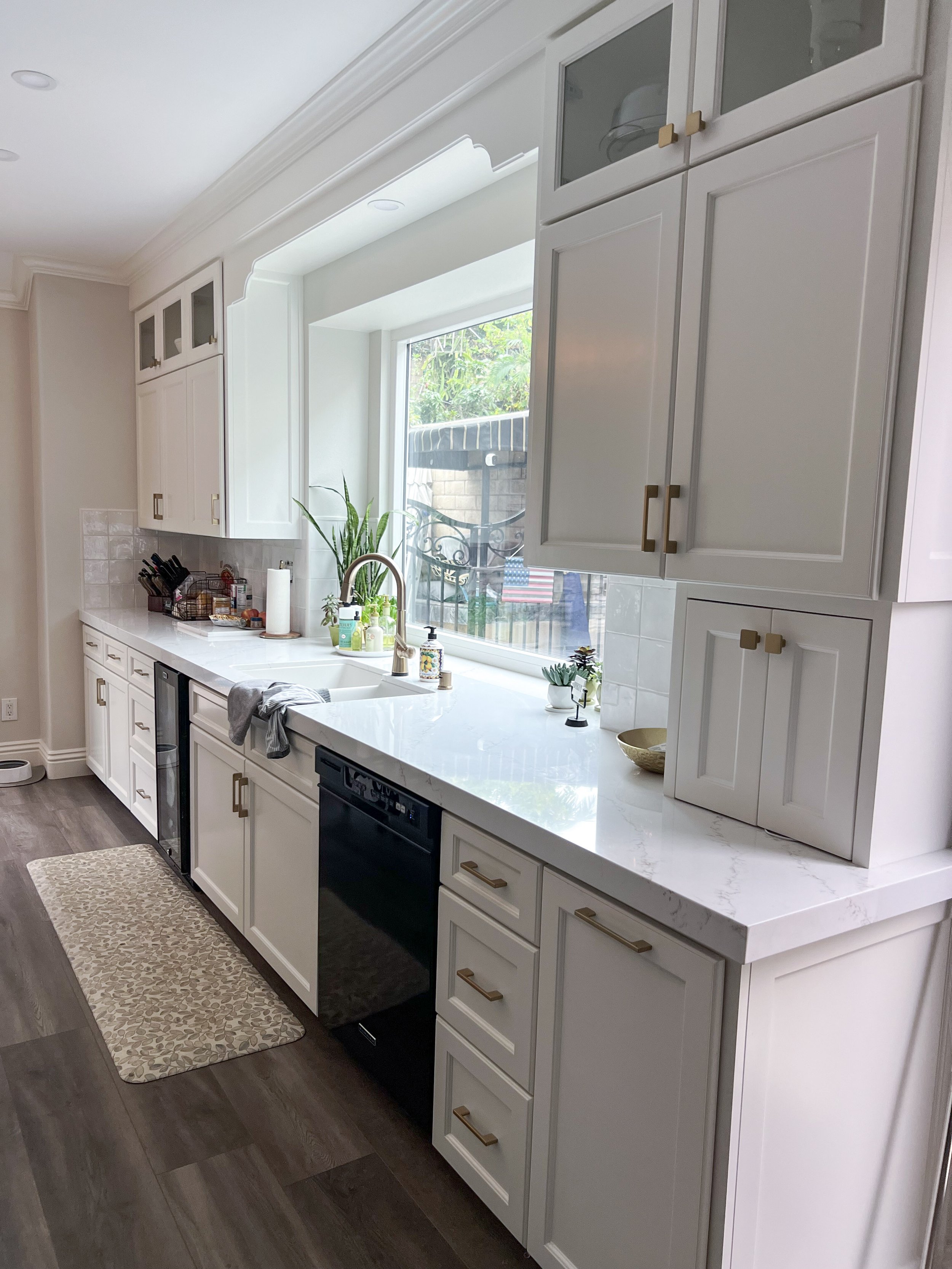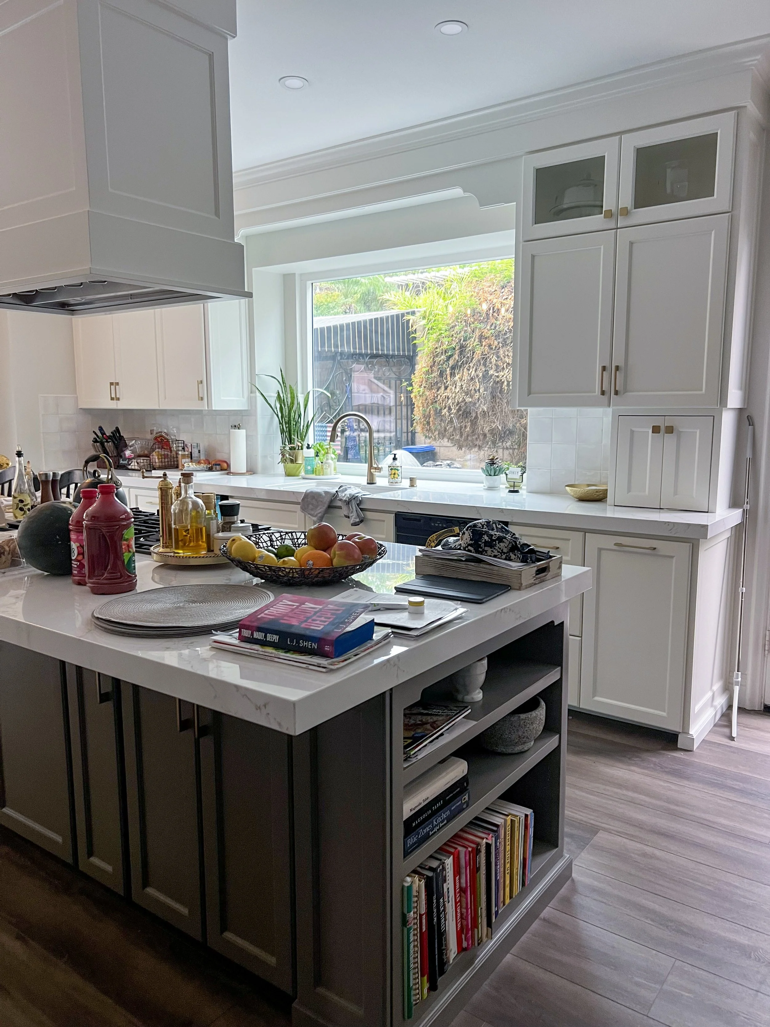 Custom Cabinets: Shaker door style, full overlay with face-frame. Expand island with added storage on back side. Varied cabinet height for wall cabinets. Range hood cabinet. Deep drawer pullouts for pots and pans. Custom window casings.