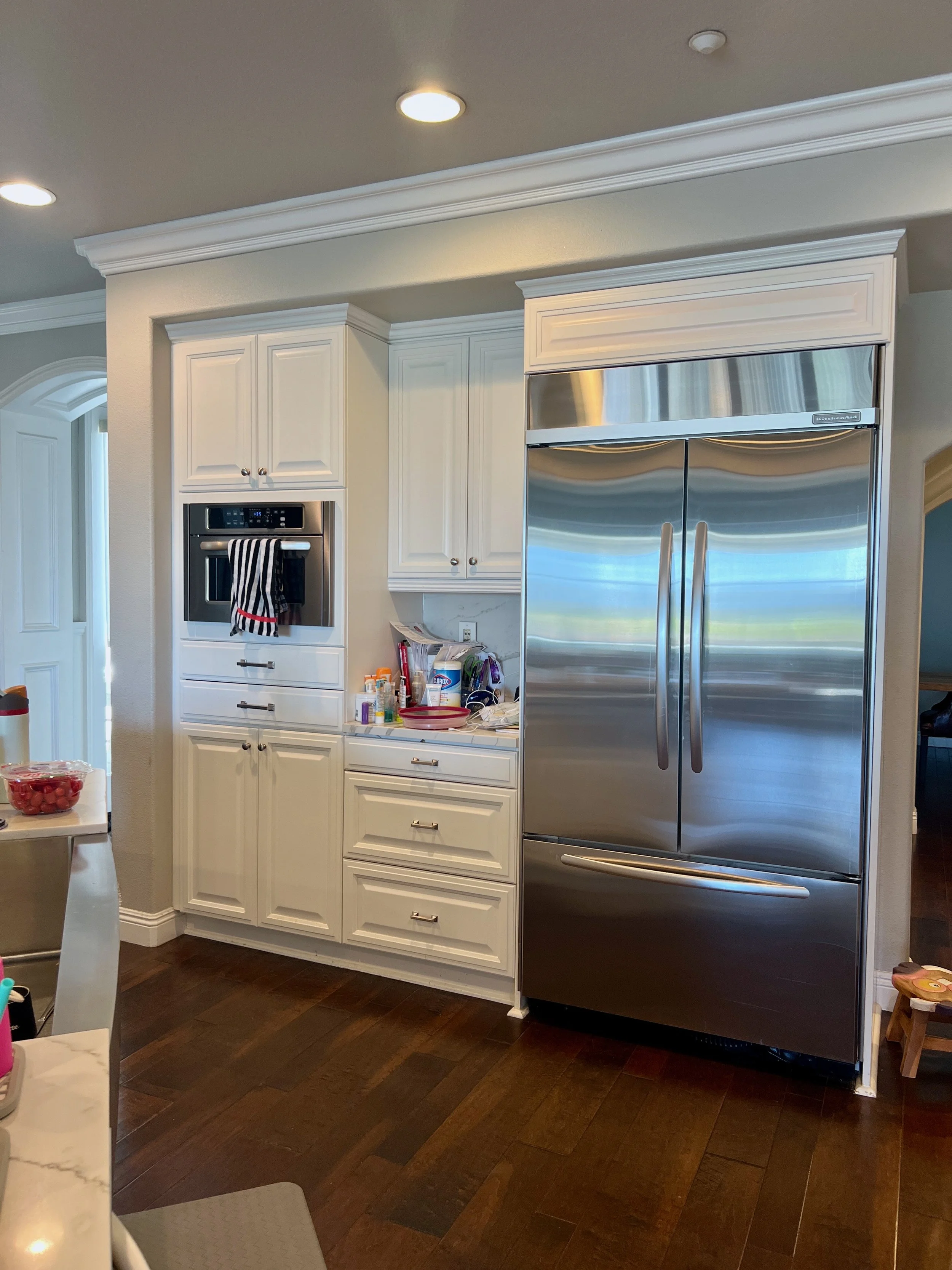 Custom Cabinets: Inset Shaker door style. Rift White Oak base and island cabinets. White lacquer upper cabinets and fridge panels. Dual appliance garages. Redesigned kitchen layout included soffit removal and floor to ceiling cabinets. Changed island orientation from 45 degree angle to rectangle, inline with wall cabinets. Increased island depth and added back side storage cabinets.