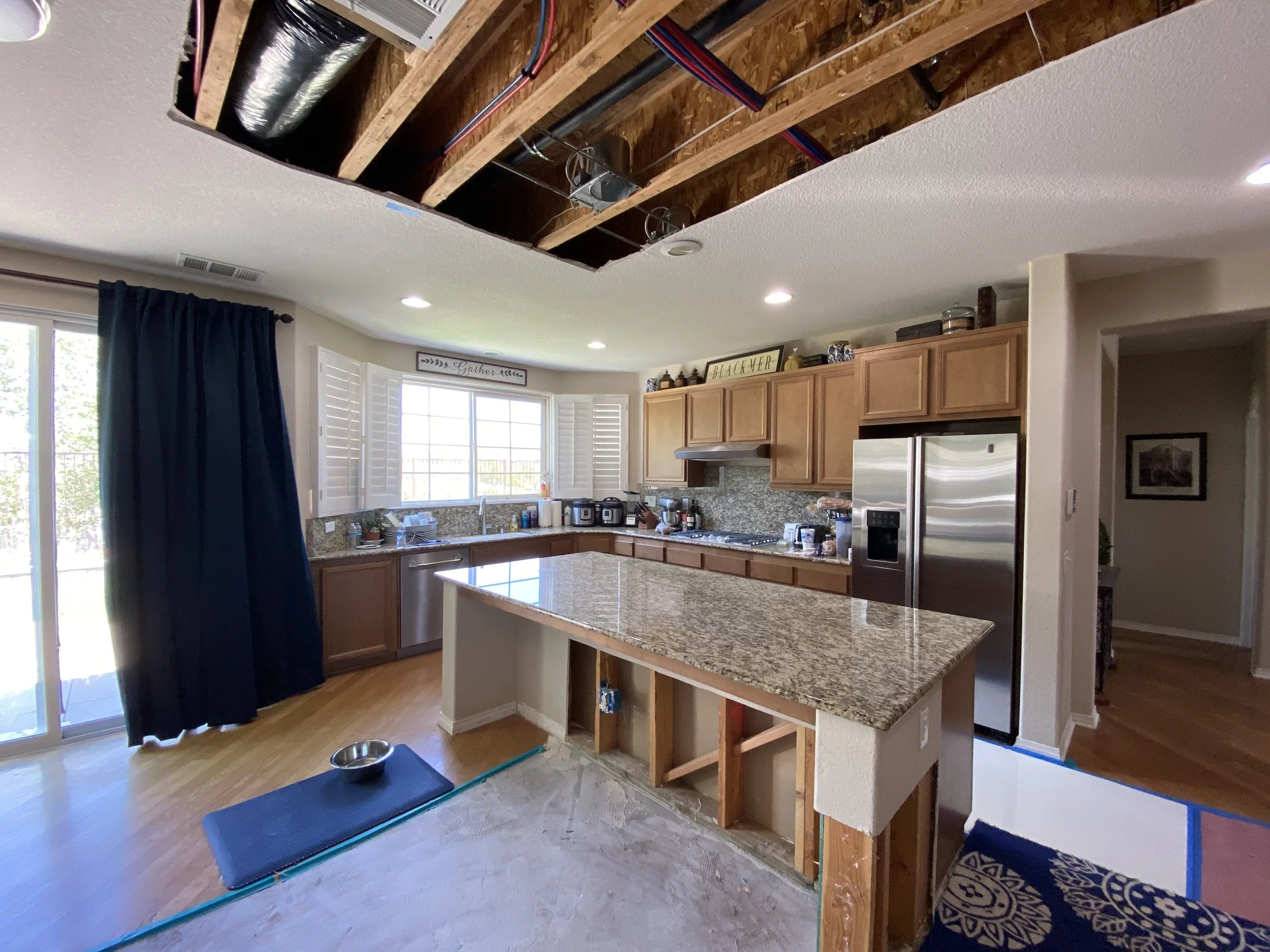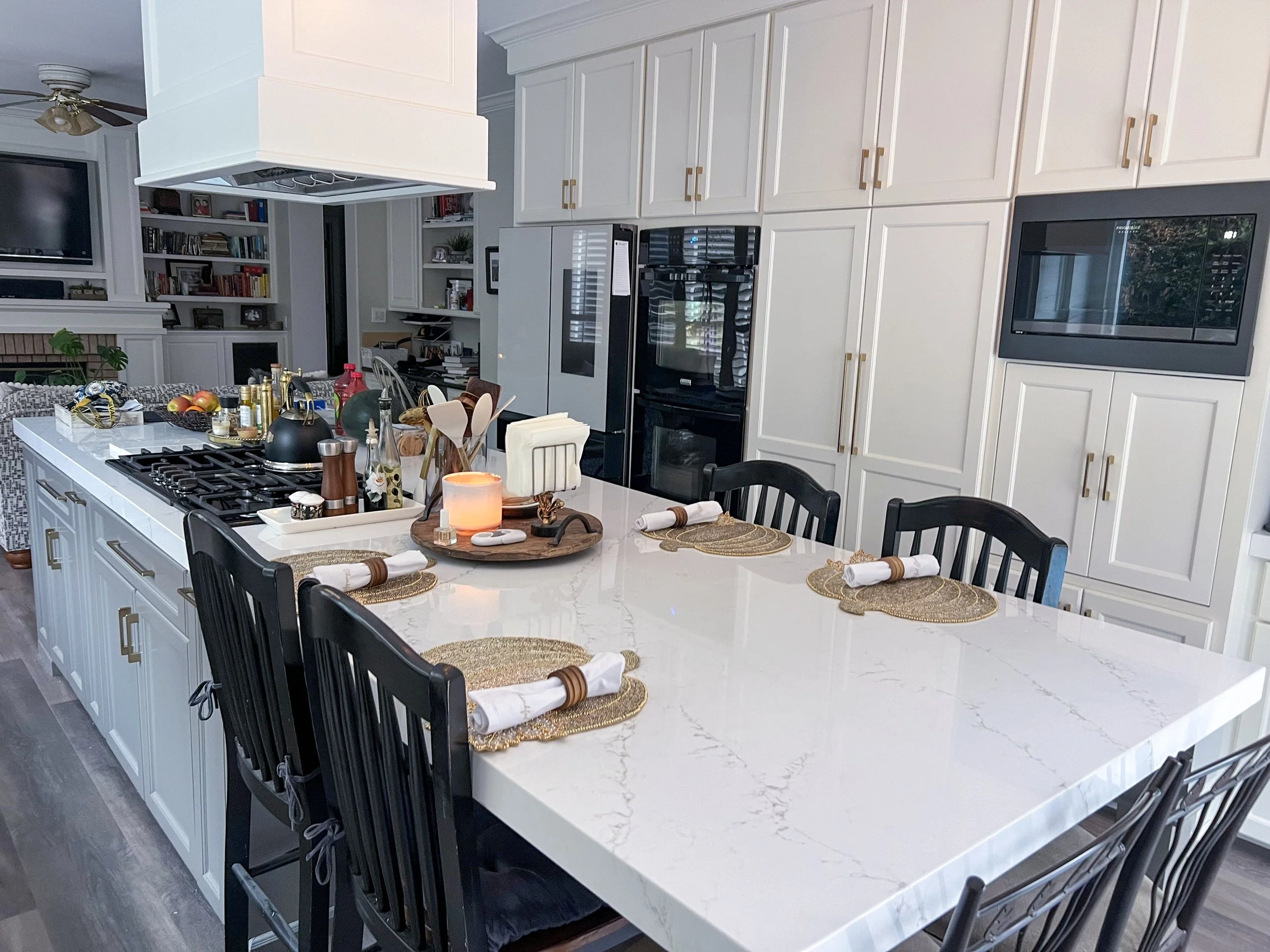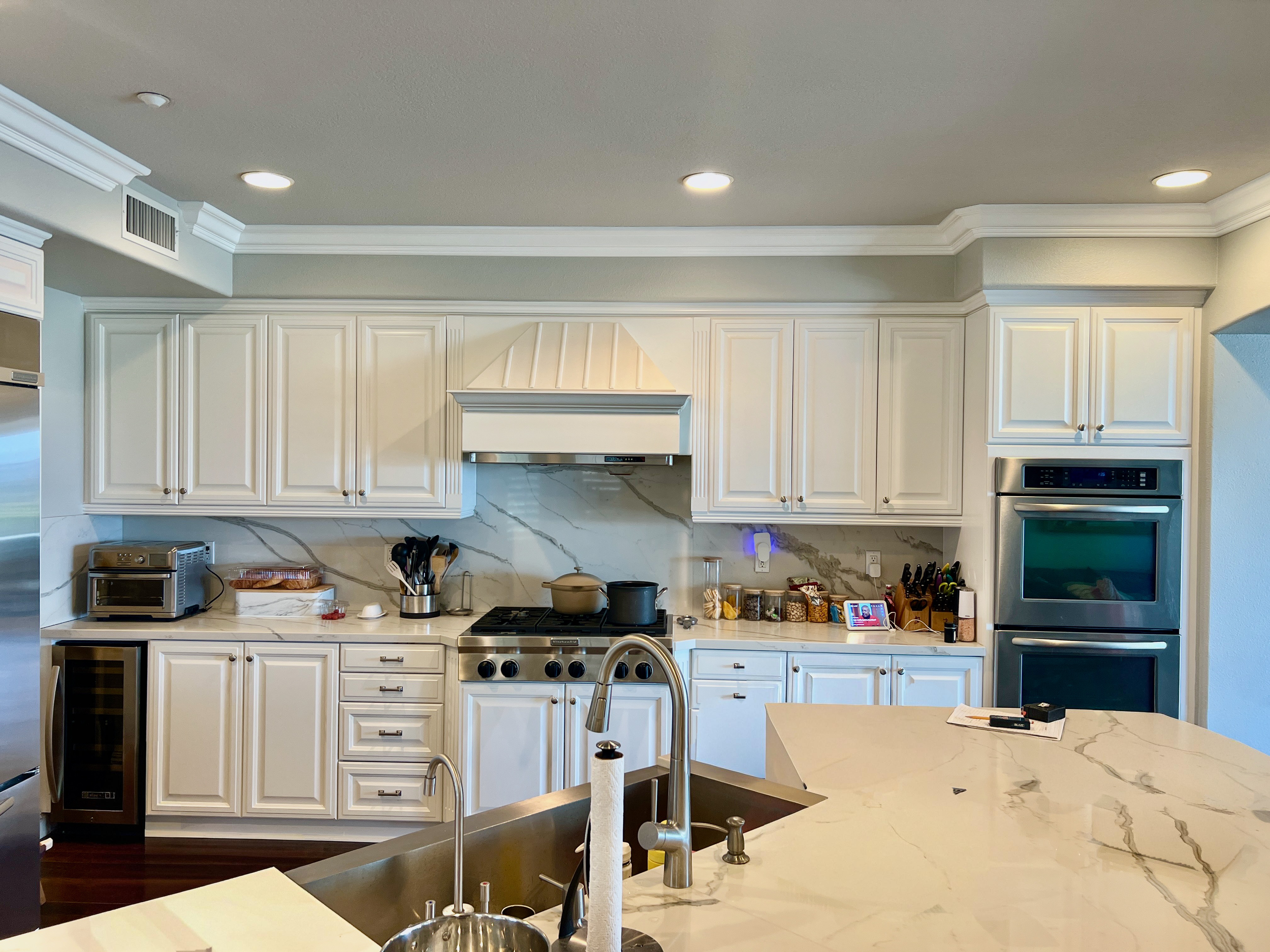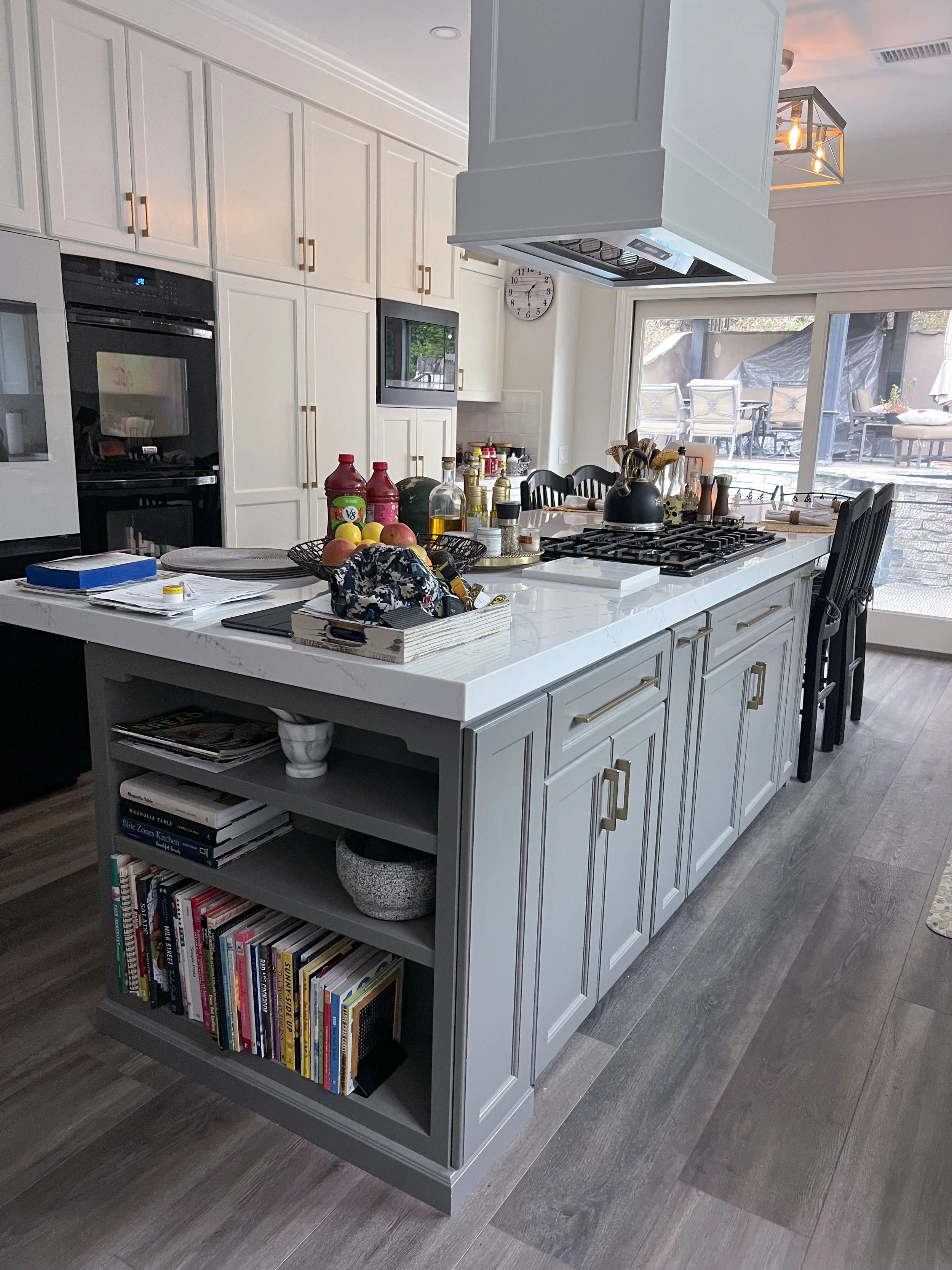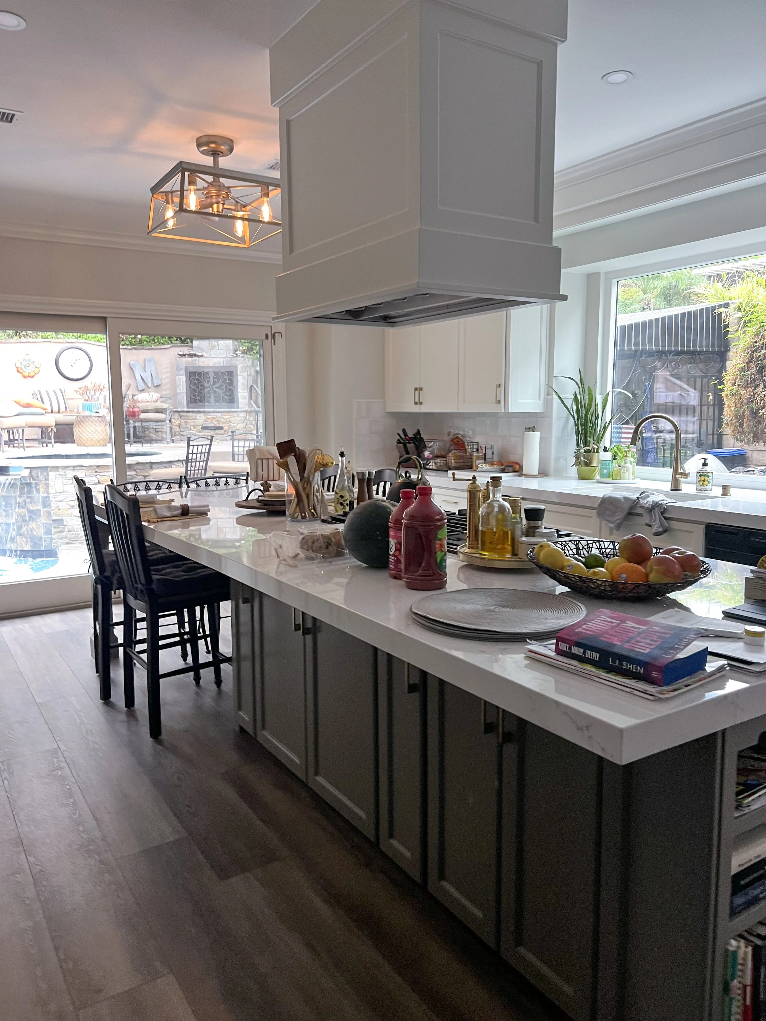 Custom Cabinets: Featuring custom doors and drawer fronts with premium 3/8” inset flat panel and 2.5” solid maple frame finished with ogee profile on both the inside and outside frame edge. Design of kitchen featured removal of soffit, replaced with floor to ceiling cabinets. Removed the island’s downdraft cooktop exhaust and replaced with ceiling mounted inset exhaust fan with custom cabinet. Extended island with built in tabletop seating. New lighting, ceiling & cabinets.