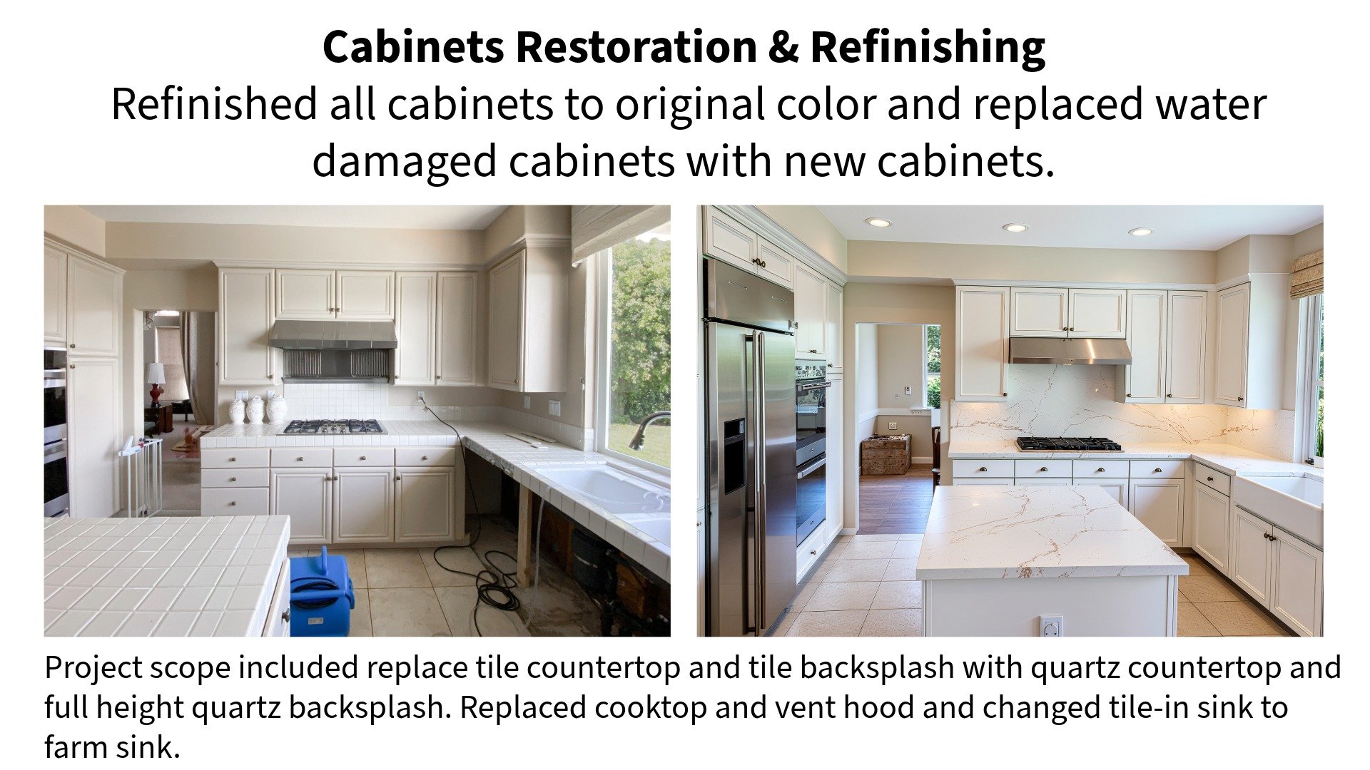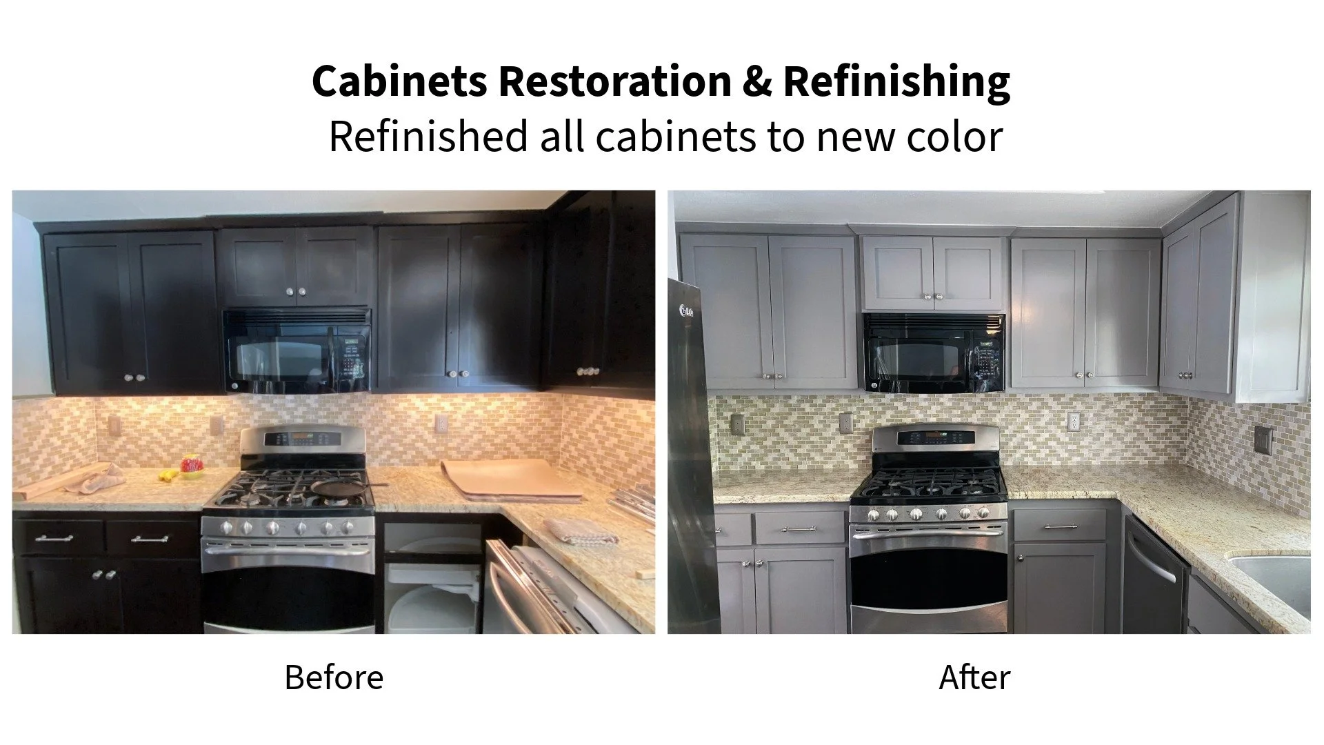 Refinish cabinets to original color or change colors to revitalize and update your kitchen. Utilize updated colors create a desired esthetic like a brighter or more modern feel, and make the space more aspiring, inviting and appear larger.