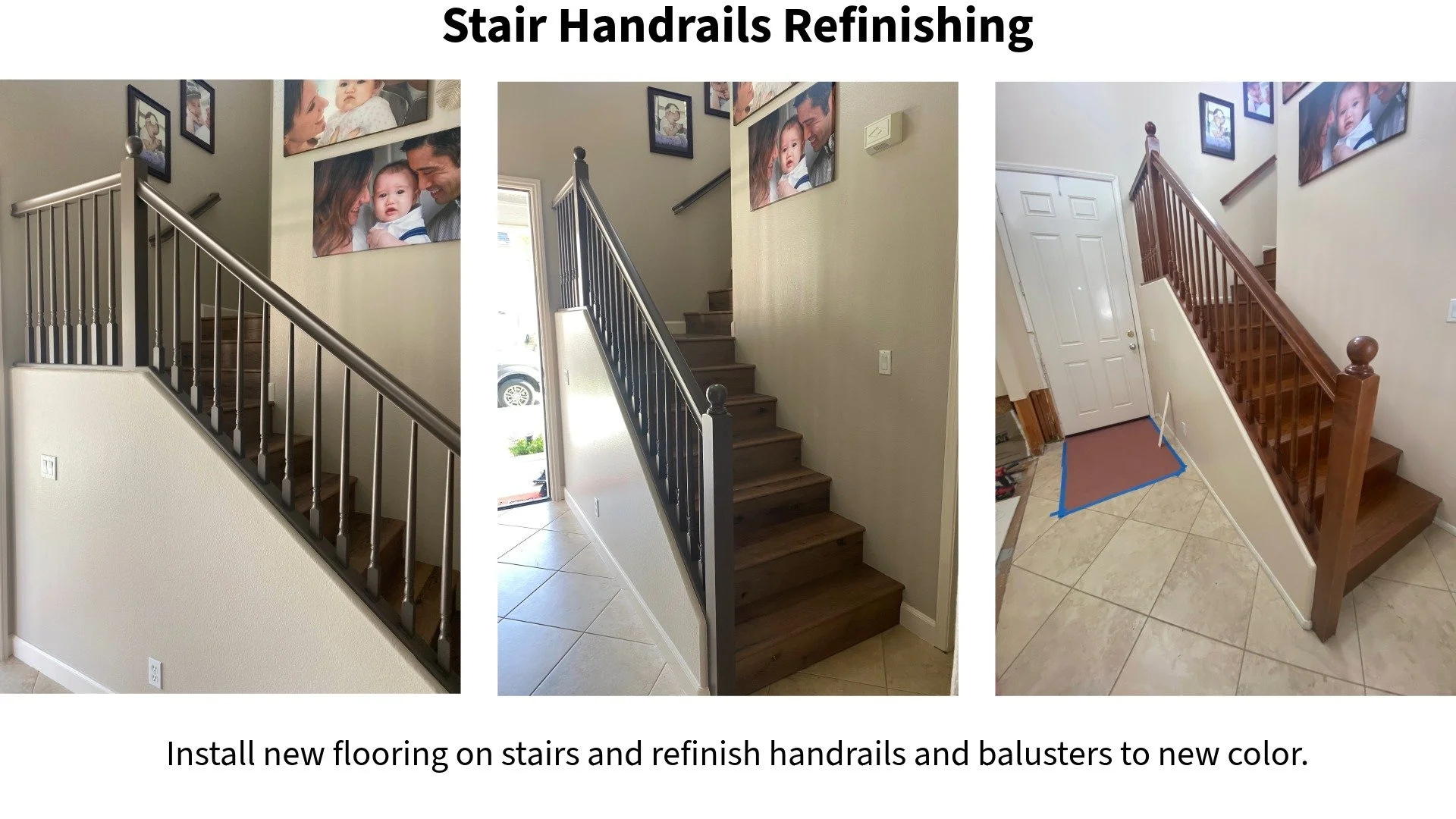 Incorporating new materials: We can replace outdated stair risers and stair treads with larger profile square or rounded stair nosing. Also upgrading stair skirting to larger size profiles. wood balusters with modern, straight metal ones—often painted black—to achieve a more industrial, contemporary feel. For a more open look, they can swap wooden railings for glass or cable.